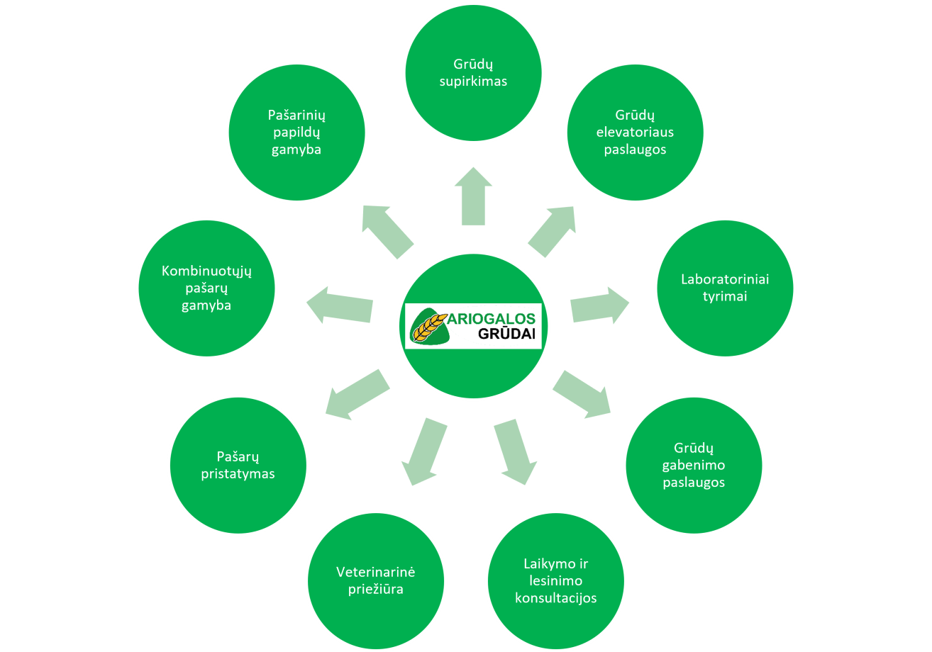 Misija – aprūpinti grūdais ir pašarinėmis žaliavomis Lietuvos paukščių auginimo kompleksus moderniausią kombinuotųjų pašarų gamyklą Ariogaloje.